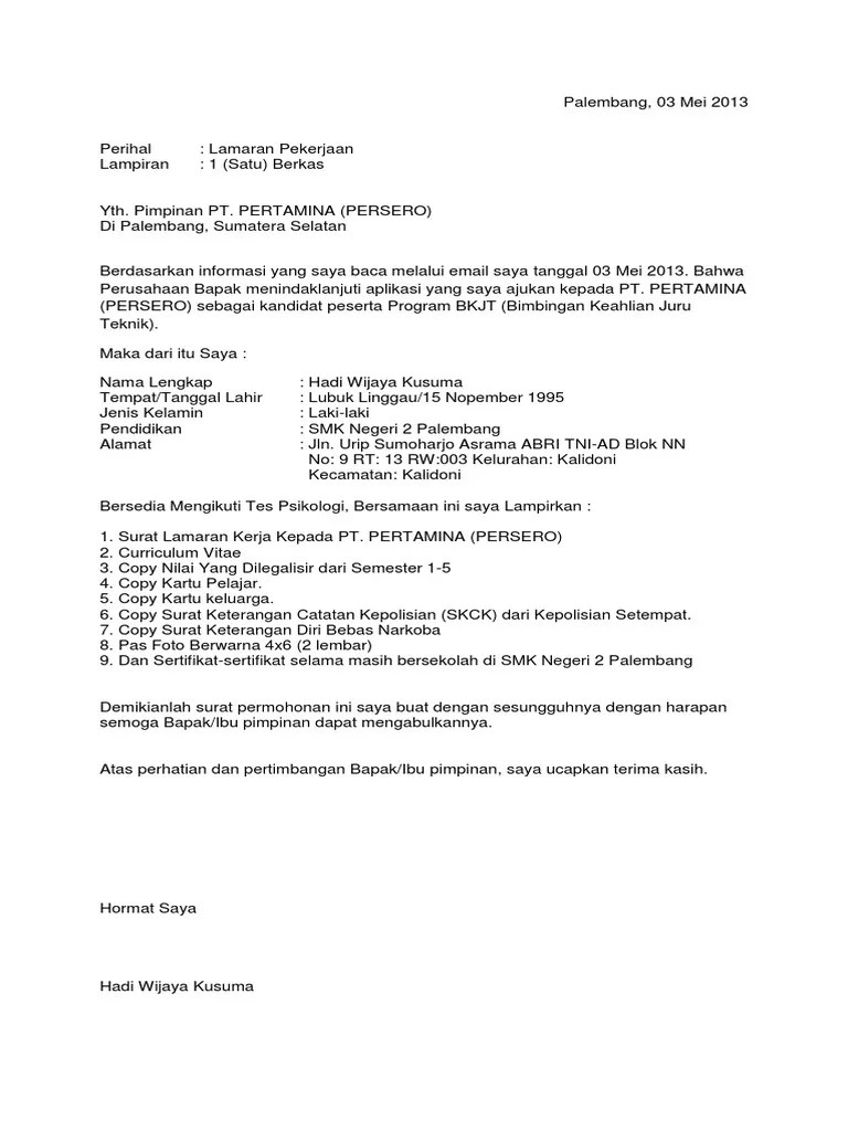 Contoh surat lamaran kerja di pertamina di bagian teknisi mesin · daftar riwayat hidup · fotocopy ijazah dari universitas yang sudah dilegalisasi. Pertamina hulu energi (nsb) point a sumbok rayek, nibong, kabupaten aceh utara, aceh 24372 perihal : Demikian surat lamaran kerja ini saya buat, saya berharap dapat menjadi bagian dari pt pertamina dan siap bekerja keras demi mencapai setiap . Sesuai dengan penawaran lowongan pekerjaan dari pt. Yang mana kita tahu bahwa banyak sekali . Media selection jalan mampang no. Hari ini marketmedan.com akan membahas mengenai contoh surat lamaran pekerjaan di spbu pertamina. Contoh surat lamaran kerja pt pertamina / contoh surat lamaran kerja di pt pama : Contoh surat lamaran yang baik dan benar by yohanes_purba_2. Pertamina, seperti yang termuat di 7 surat lamaran kerja di pt cv kreatif surat . Admin mengumpulkan dari berbagi sumber terkait contoh surat lamaran kerja pertamina via email. Kumpulan contoh surat lamaran kerja bahasa inggris yang baik dan benar,.